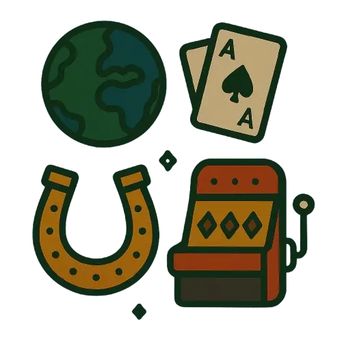 Online casino sivustolla pelaamista kuvaavia symboleita kuten maapallo, pelikone, lippu ja pelikortti